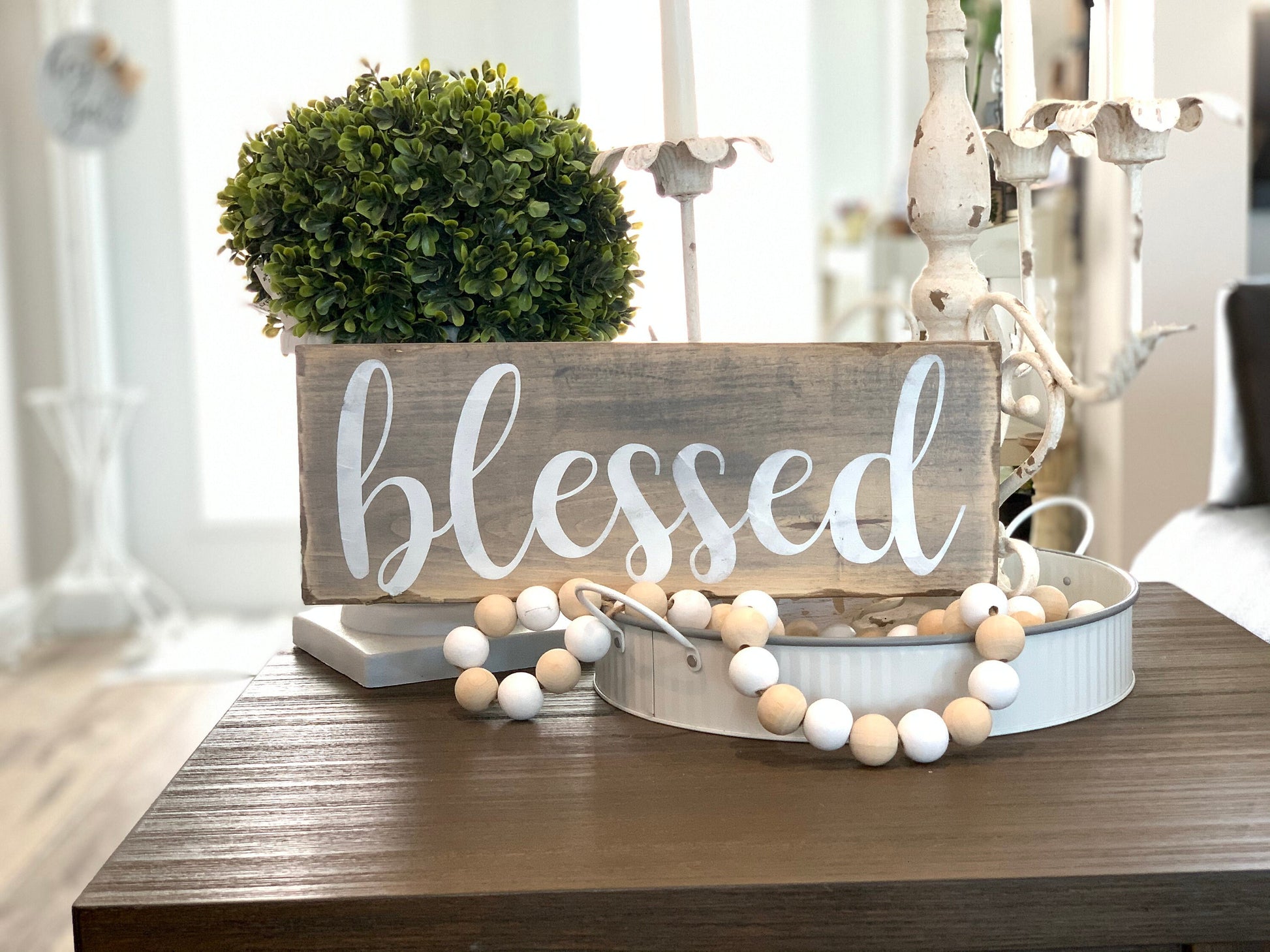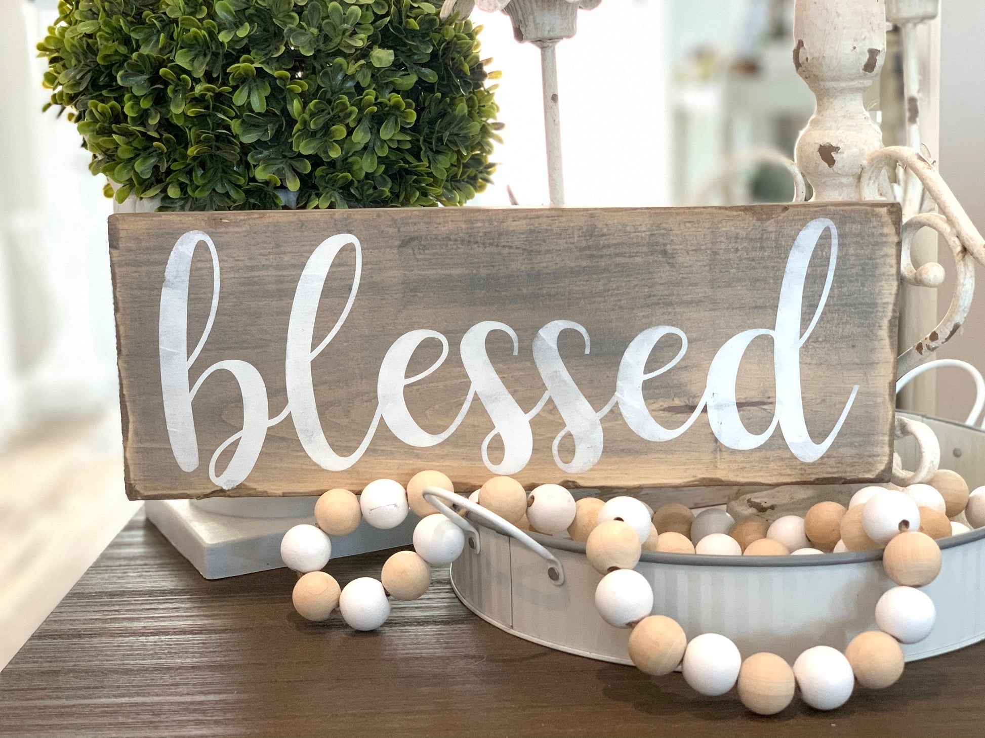 This is a handmade rustic wood sign with the word "BLESSED" painted on it. It measures 15" x 5.5" x .75"