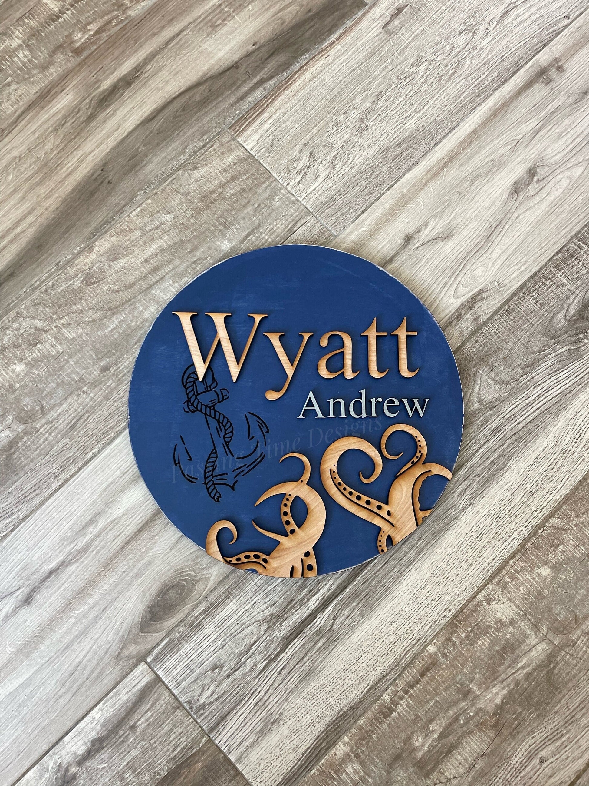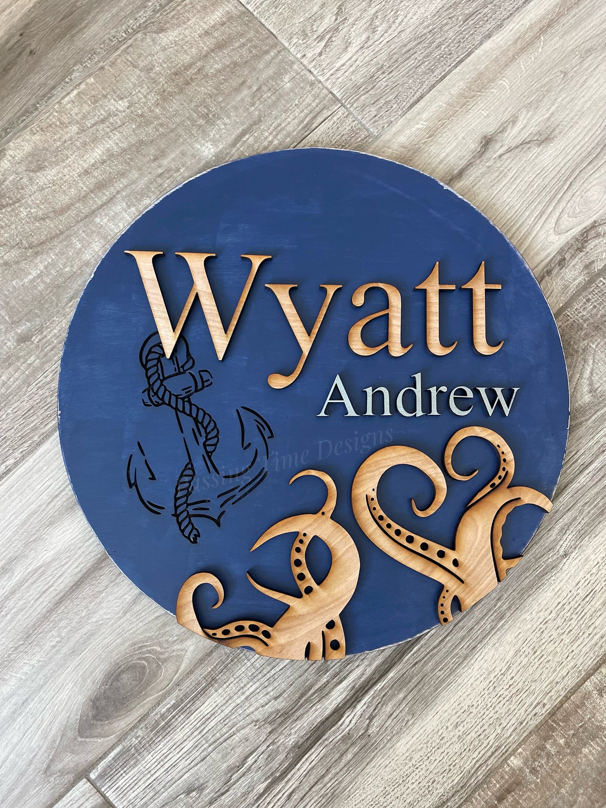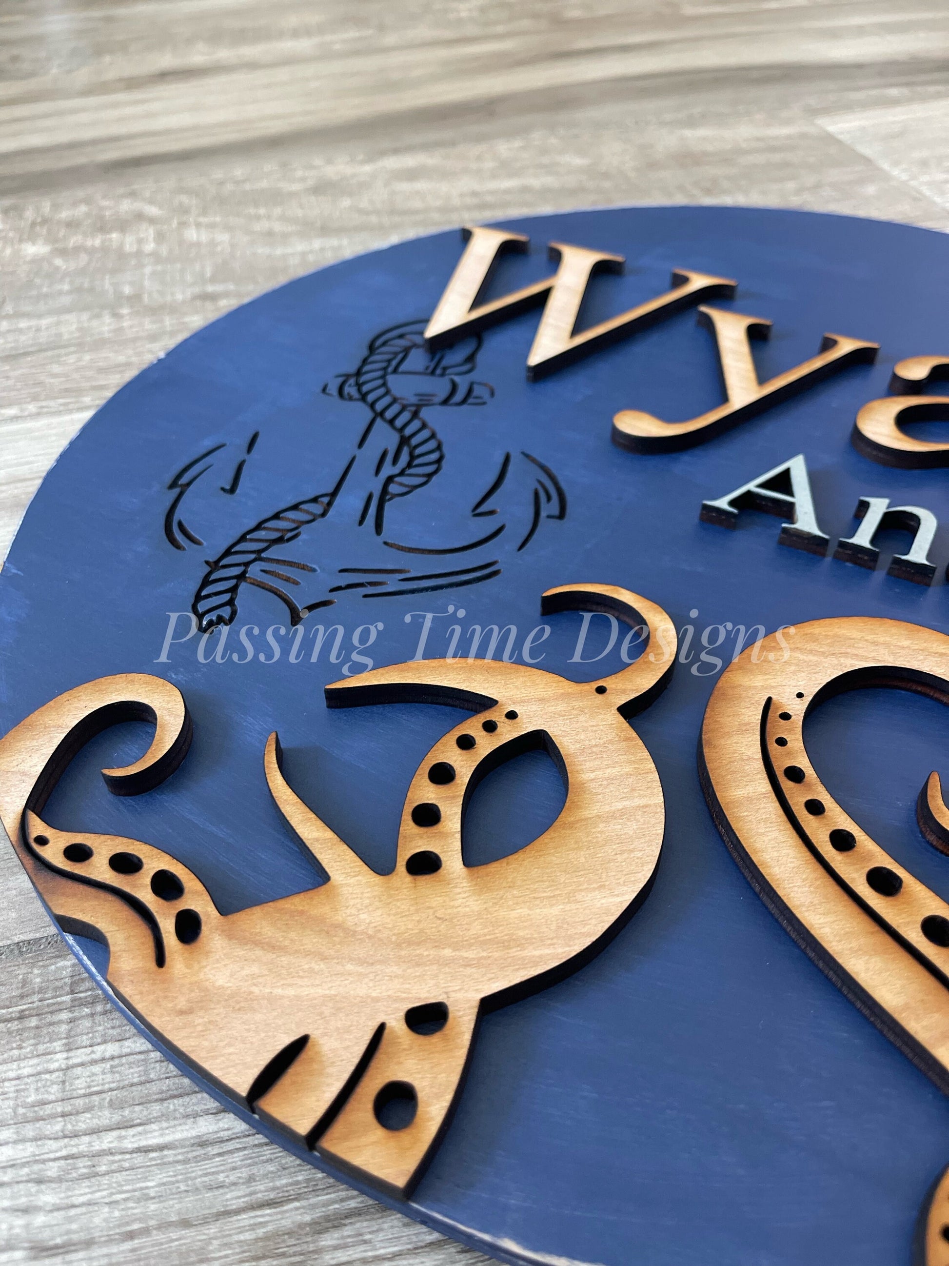 This 3D name sign is made of wood, painted, engraved, and sealed. It measures approx 15 inches from side to side. The name and octopus legs are cut out of wood and glued to sign to give it a 3D look. The background (blue) is sanded to give it a rustic look. The anchor is engraved. The anchor, name and octopus legs come in colors shown in photos, you may choose a different background color (to replace the blue). Please choose from the color options shown in photos. Font comes as shown in photos.