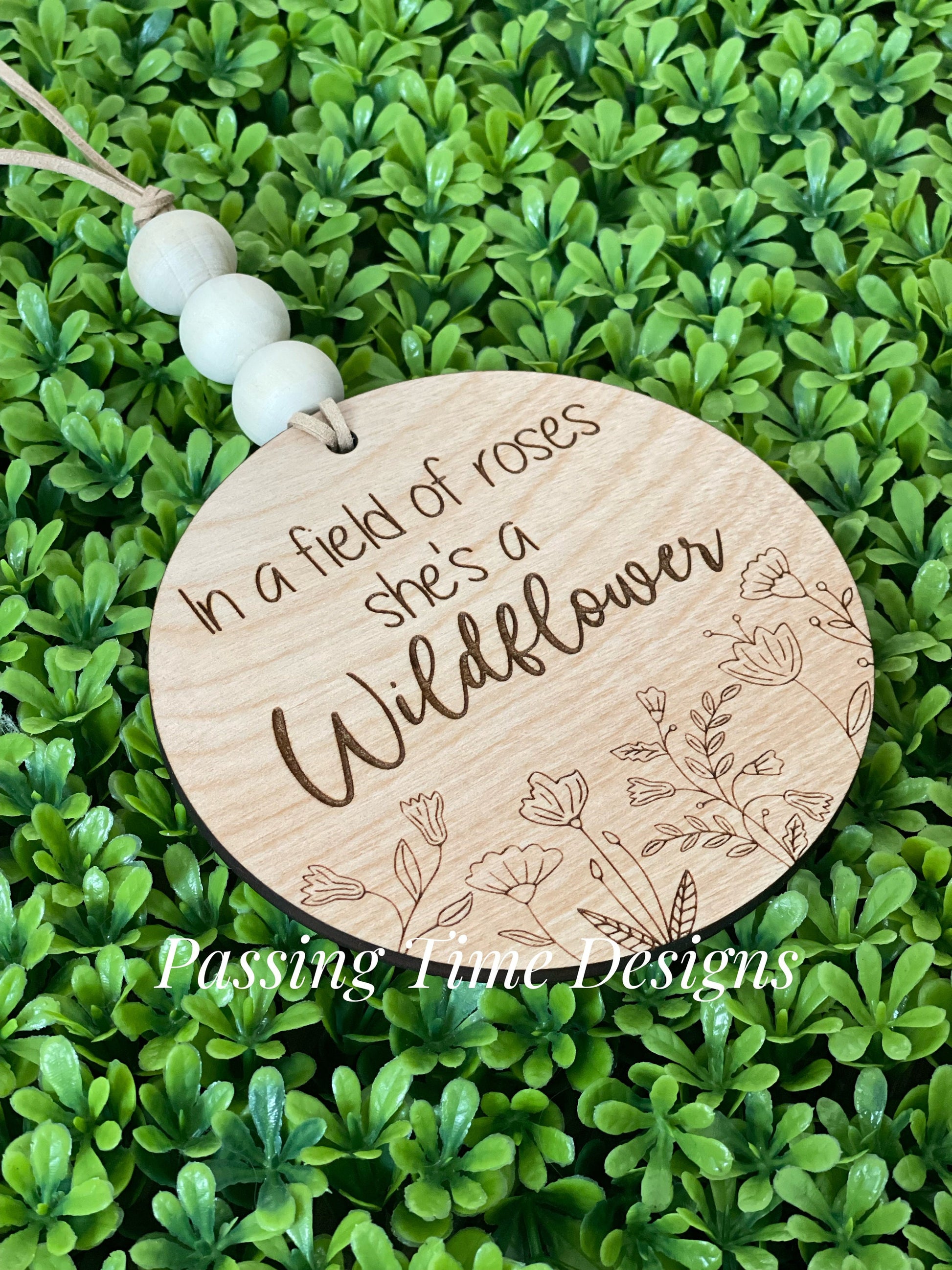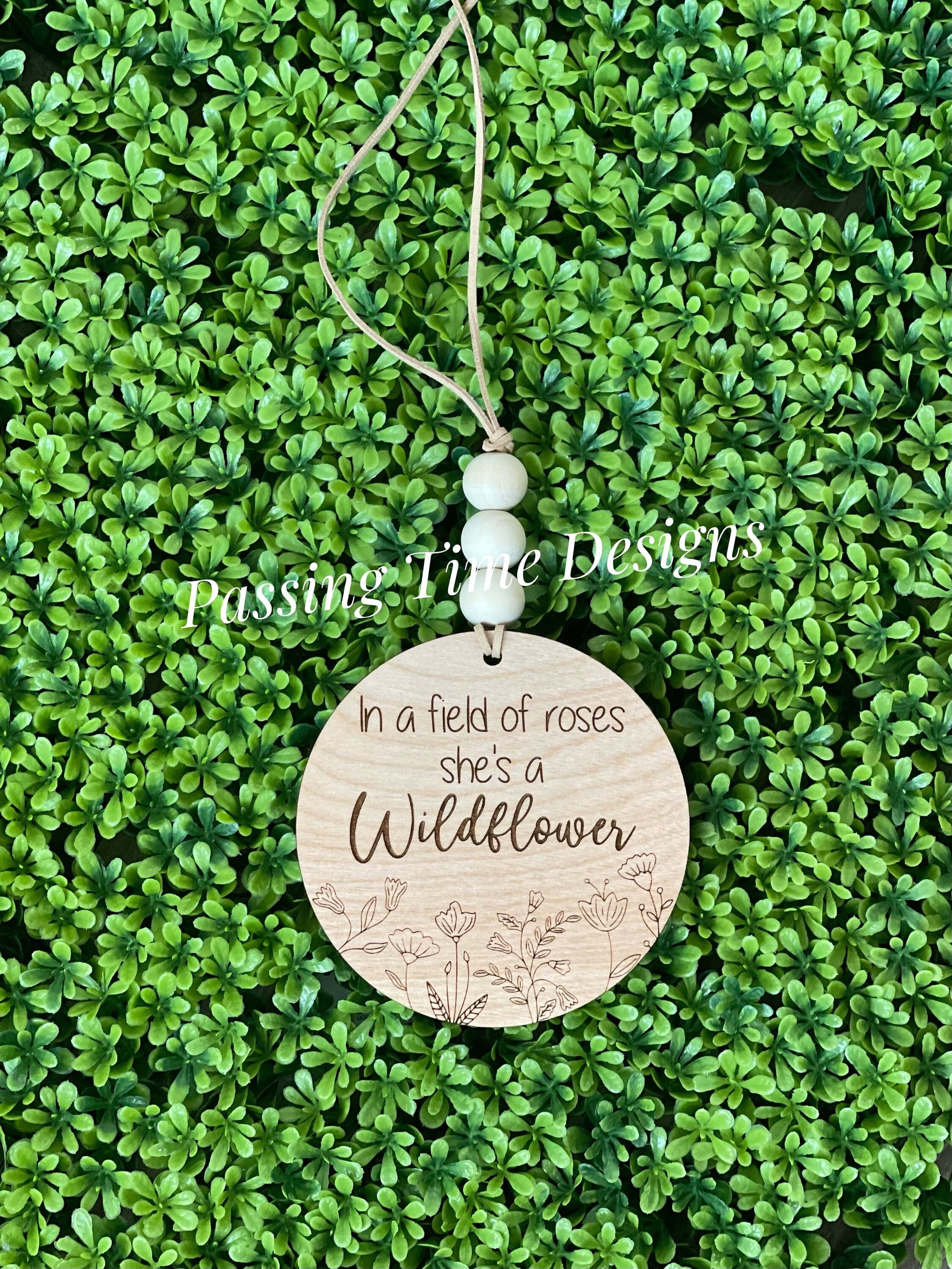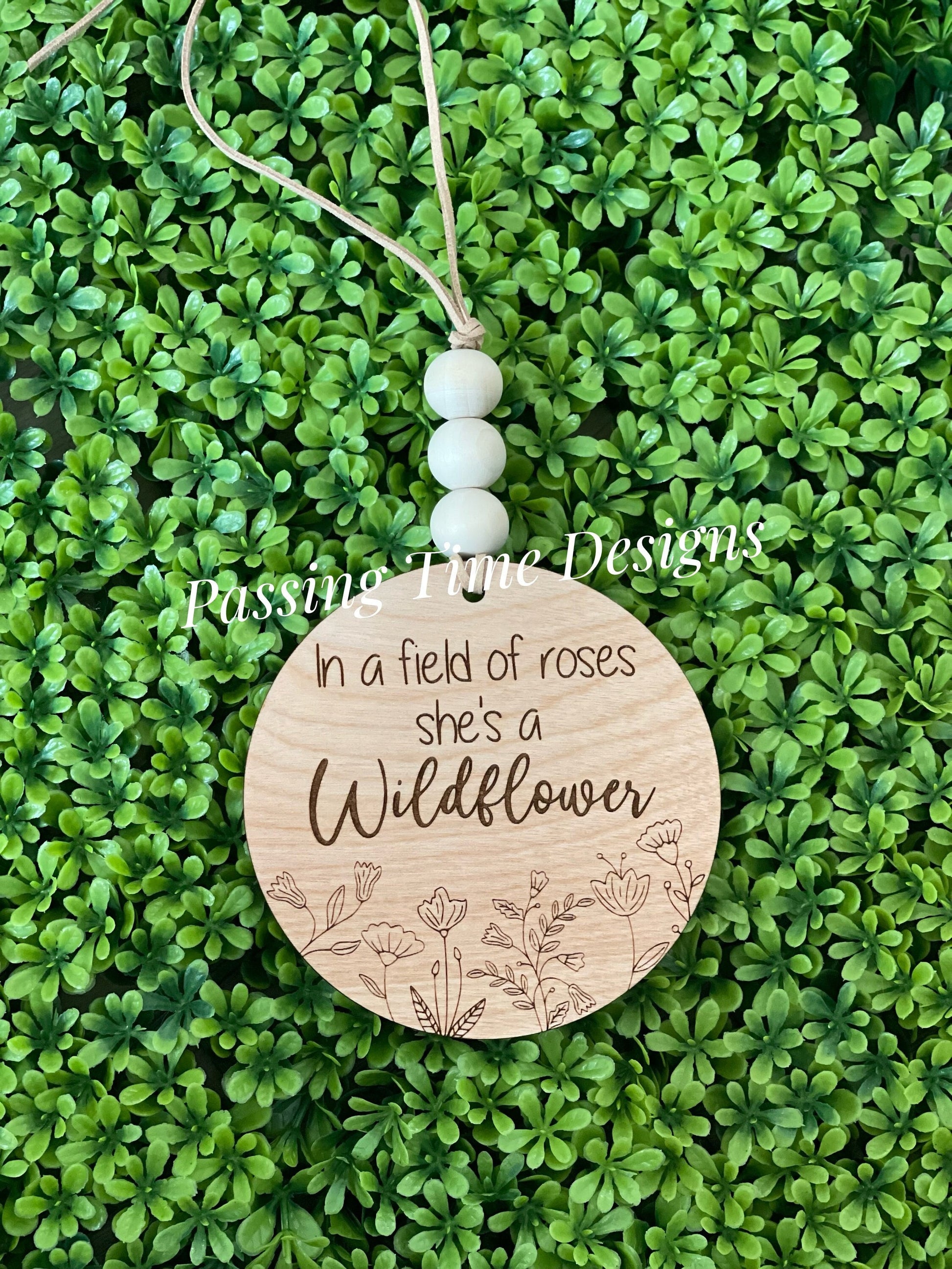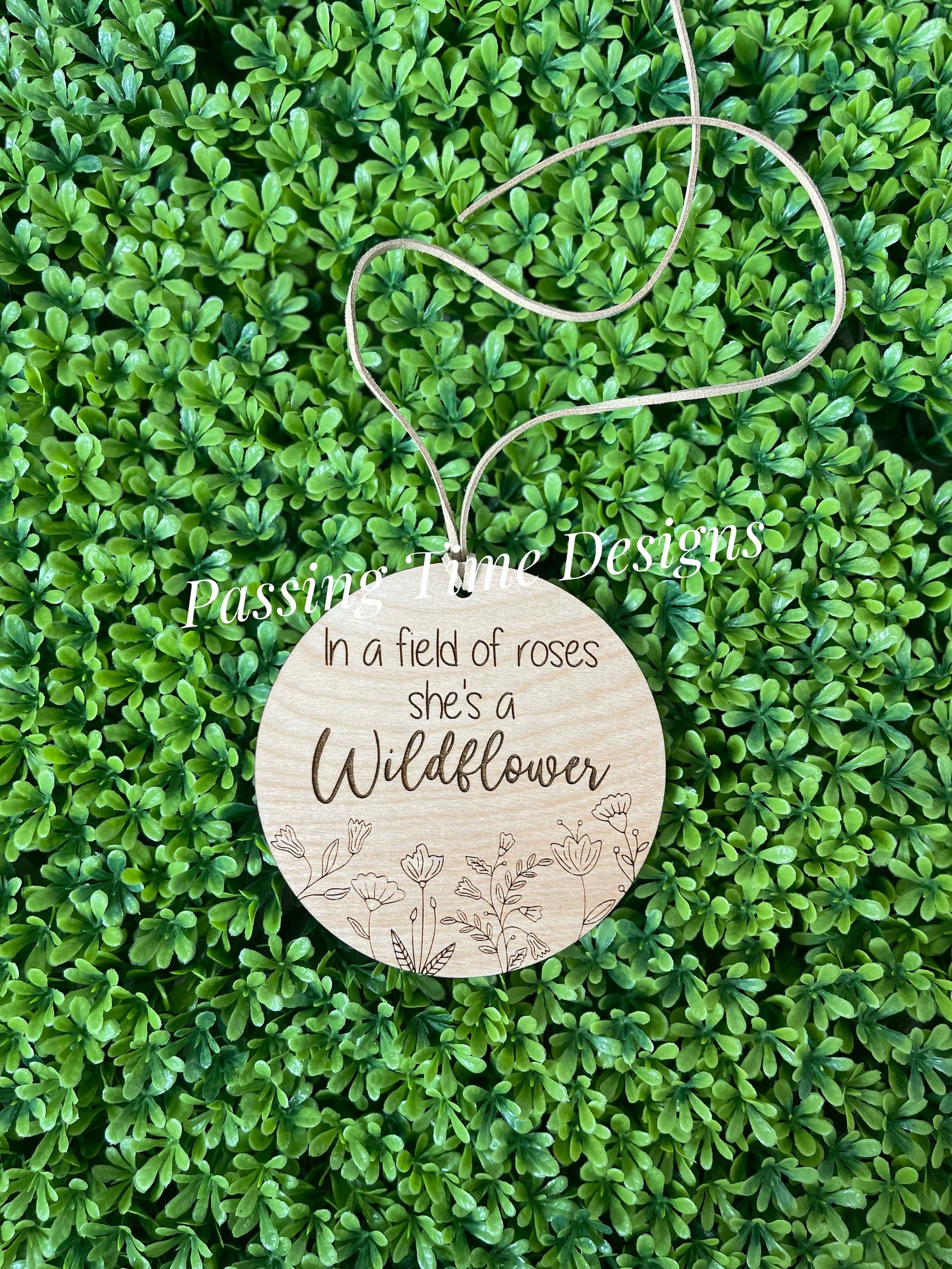 "In a field of roses she's a wildflower" quote engraved on one side of the tag. Back side is blank.