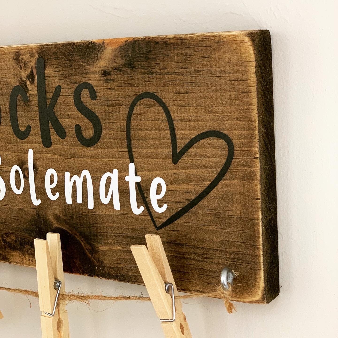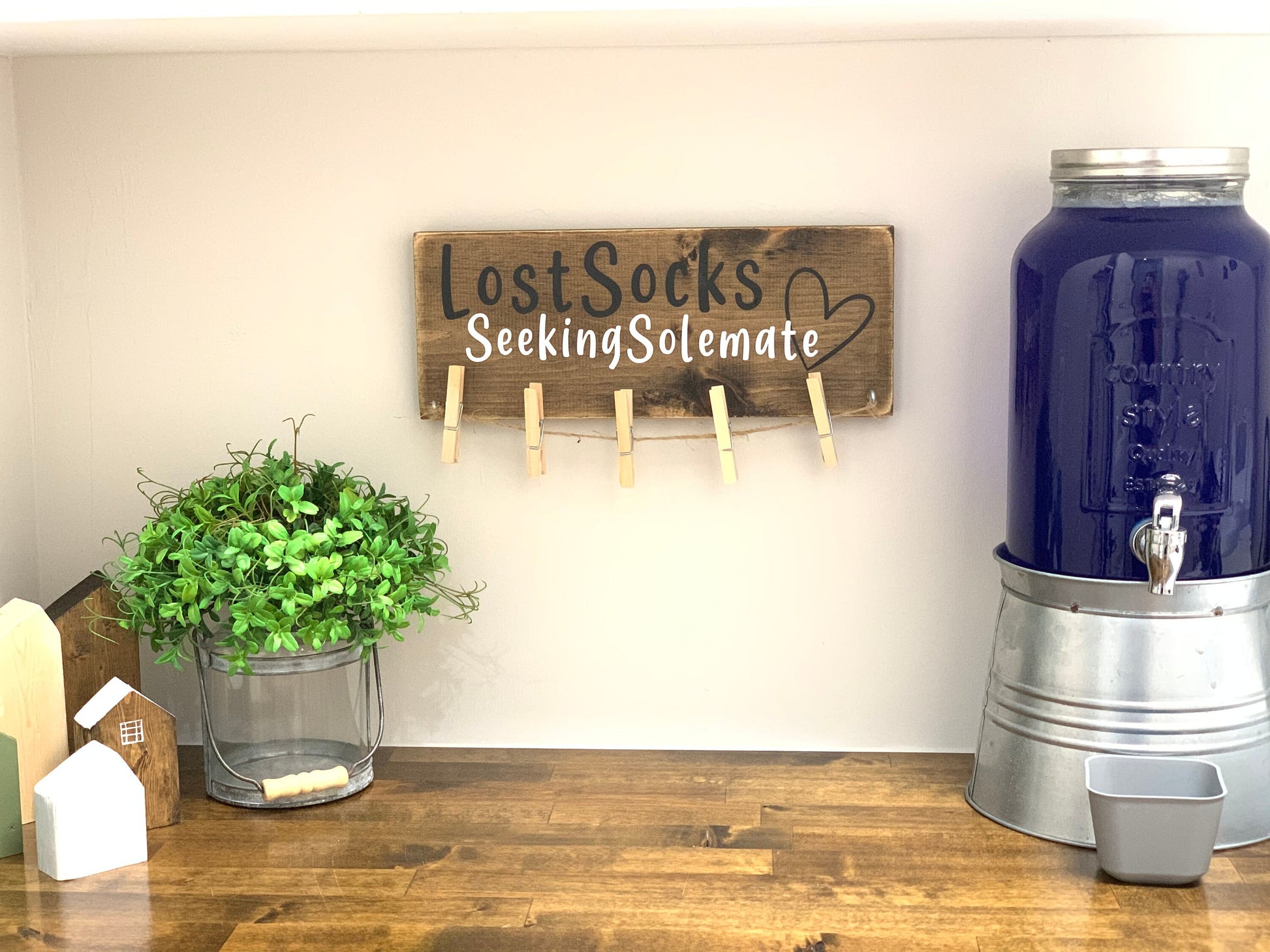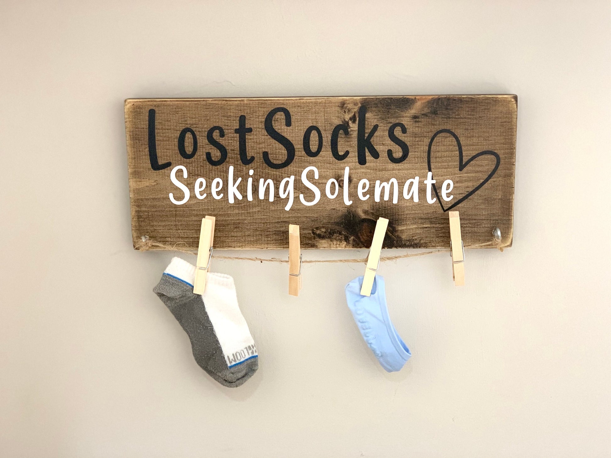Funny laundry room sign. "Lost socks seeking soulmate" adds humor to any laundry room. It also serves a purpose, hang on to those single socks until the dryer spits the missing sock back out.