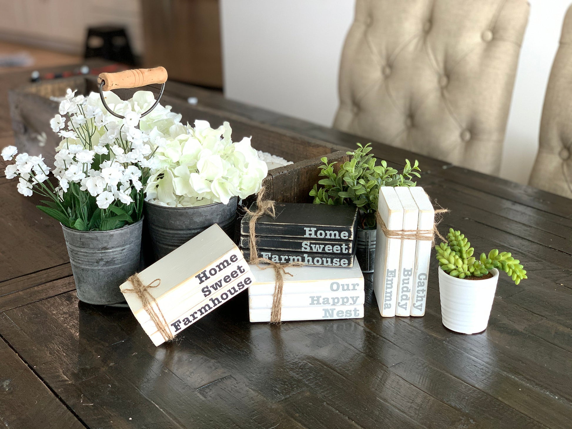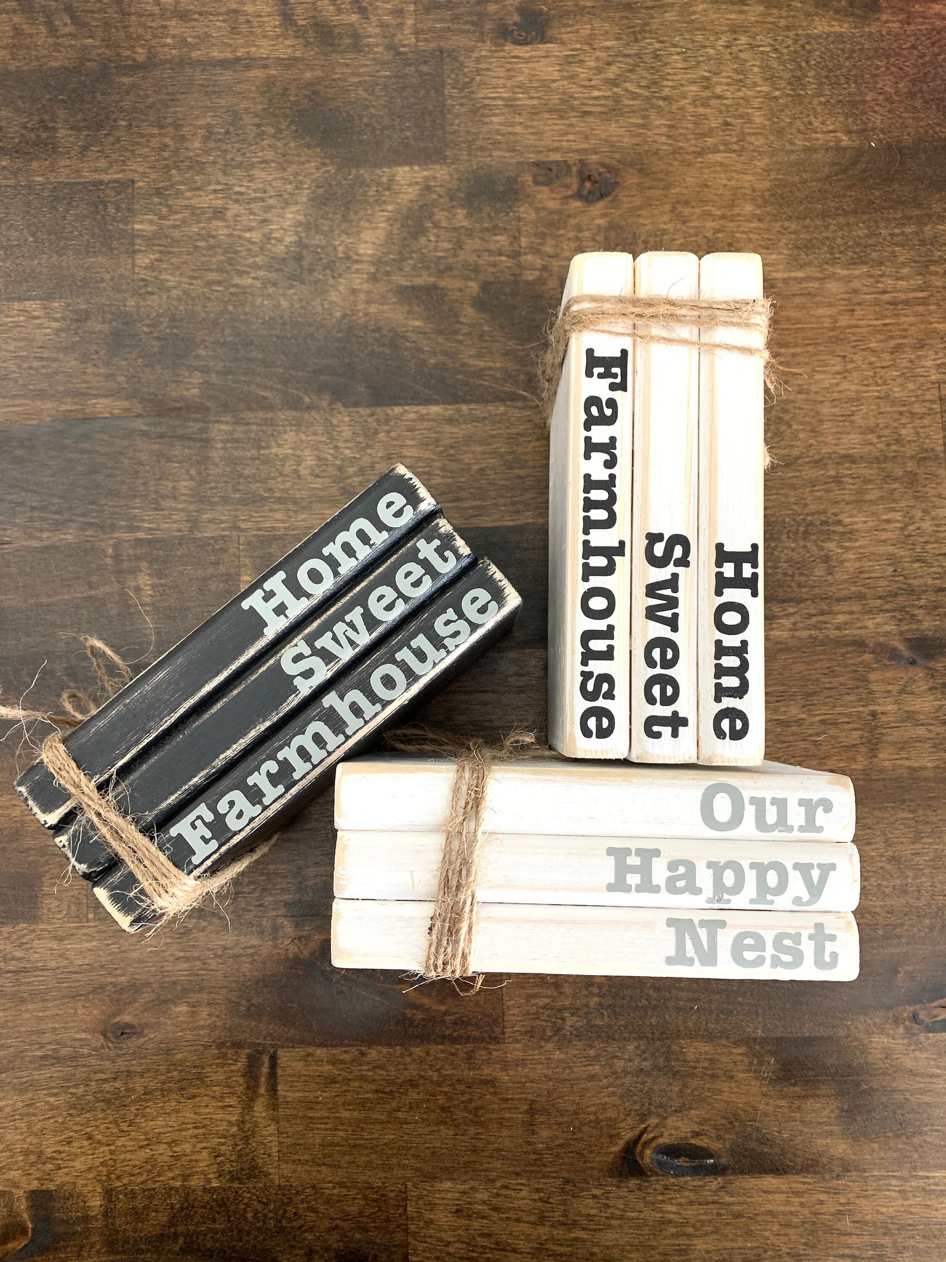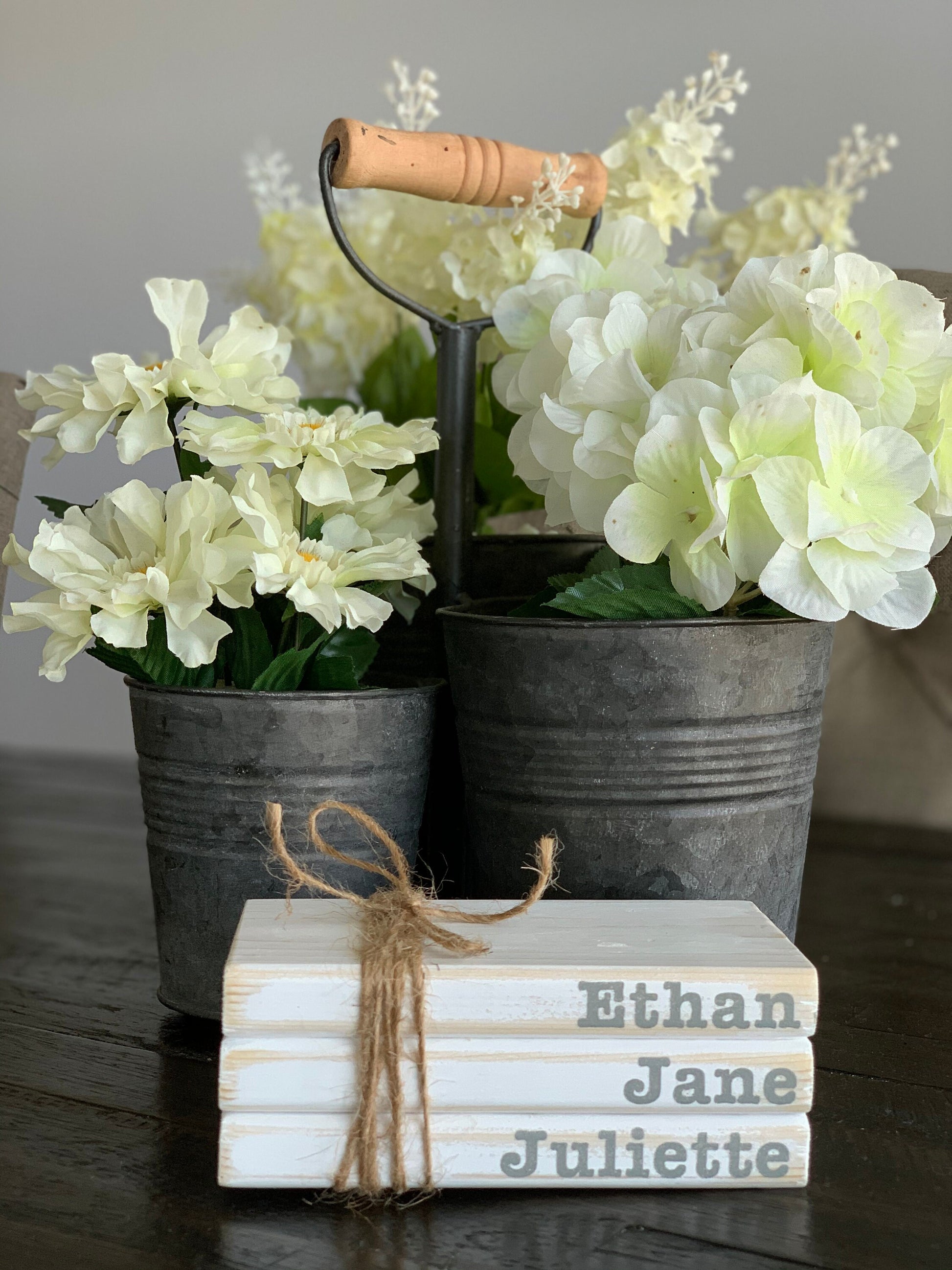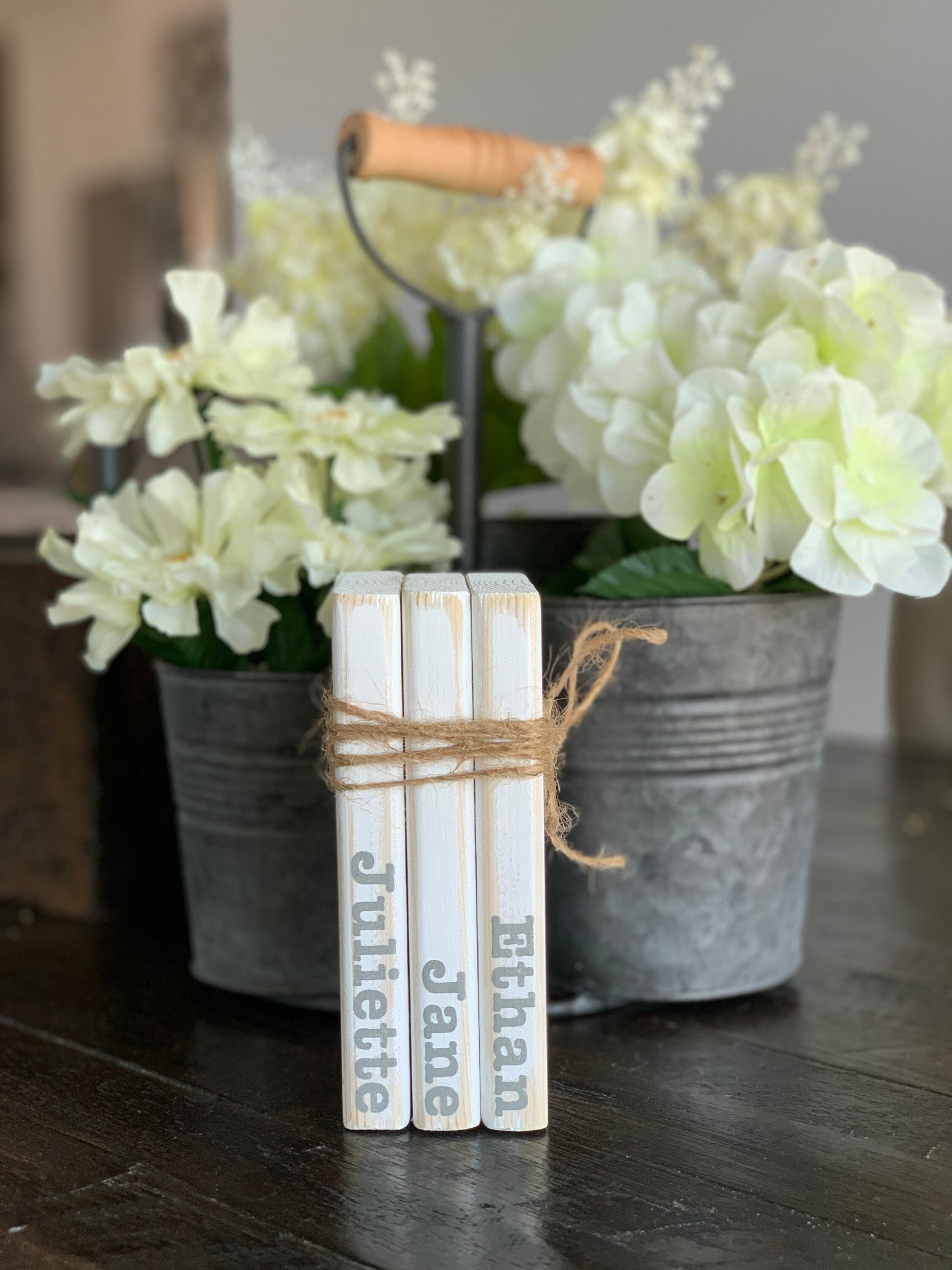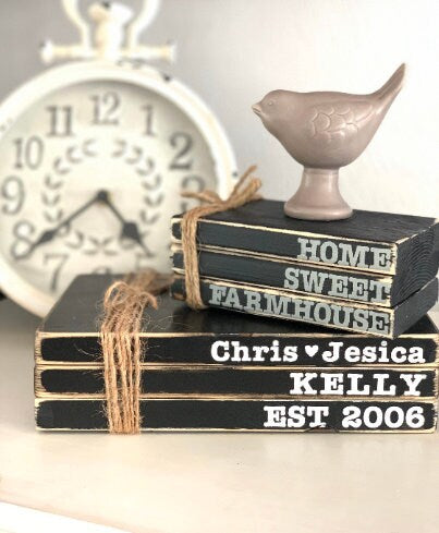 Set of three personalized farmhouse wood book stack, wrapped with jute.