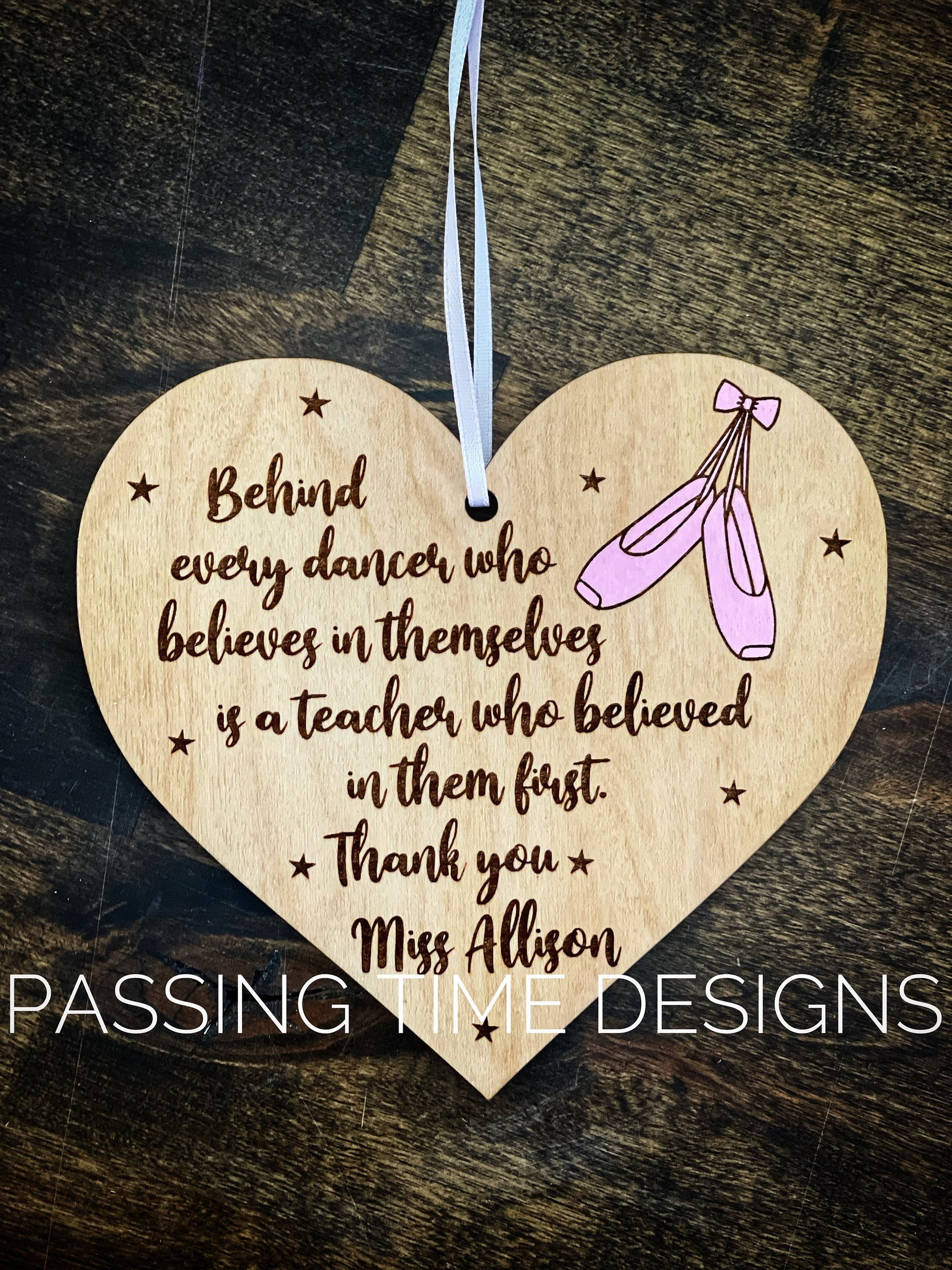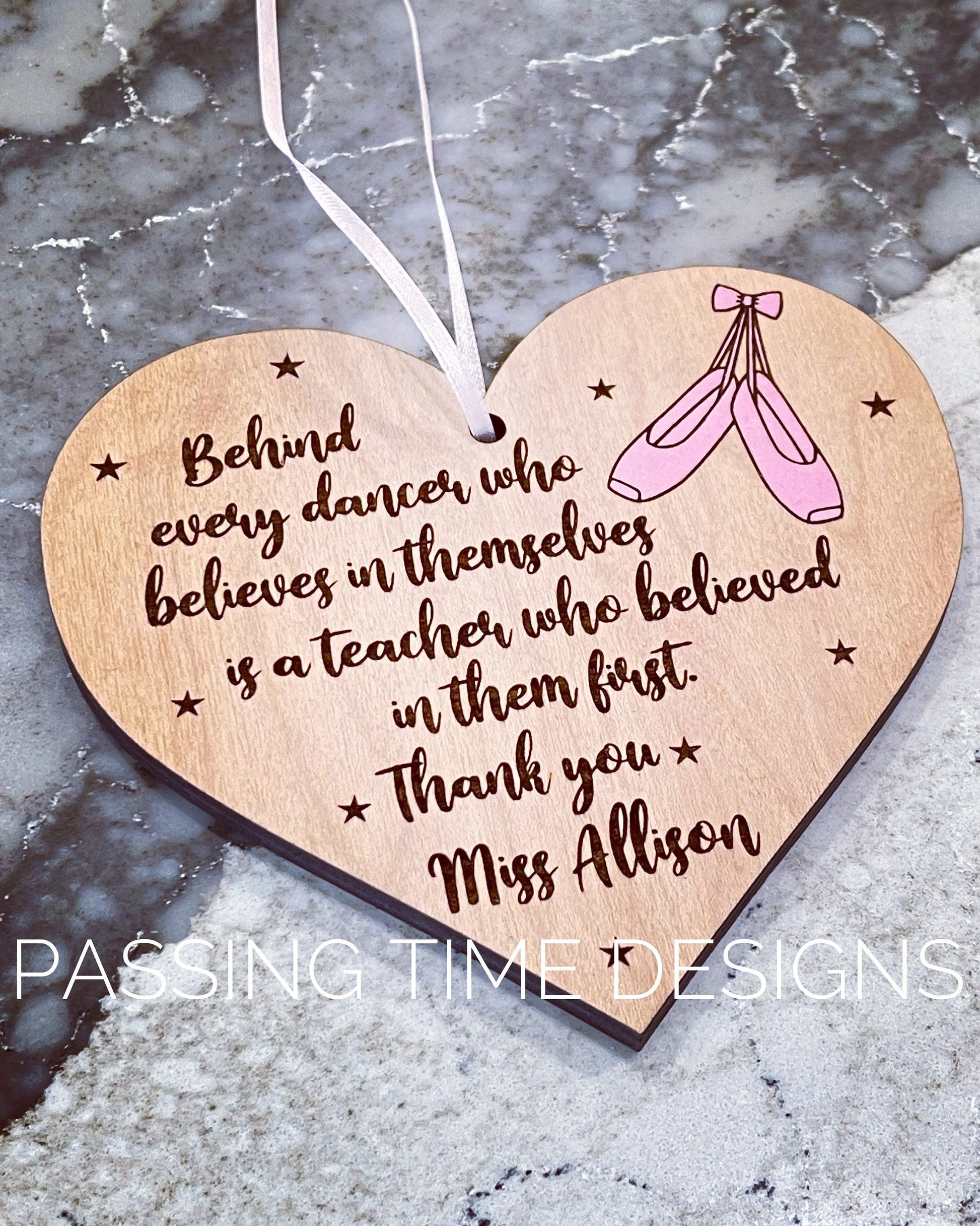 Let your ballet teacher know just how much she means to you. This adorable, personalized ballet teacher ornament will be sure to fill your teachers heart for years to come. This keepsake is made of wood, engraved, hand painted and sealed to last a lifetime. One teacher name per ornament please. It comes with pink ribbon to hang it with. Back side is blank (has our shop name on it), design is only on one side. You can order it WITH the hole and ribbon to hang, OR with no hole and no ribbon to lean up against something instead of hanging. Please note teacher's name in notes when ordering.