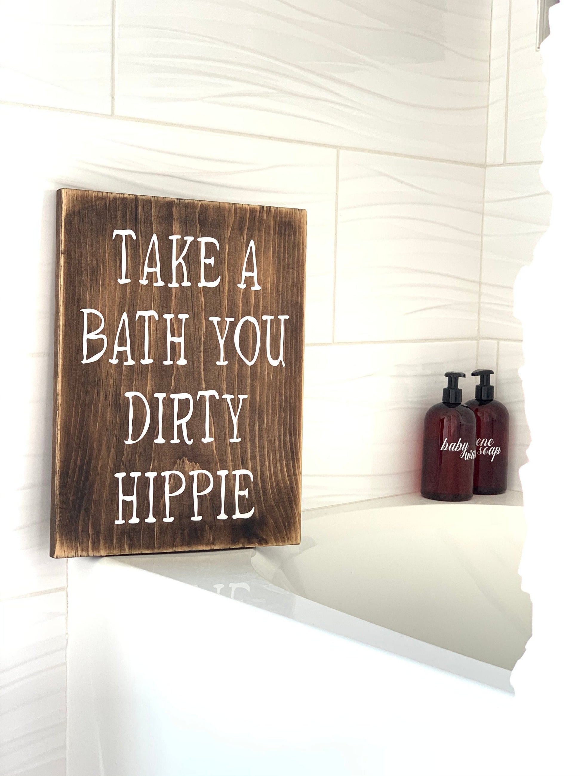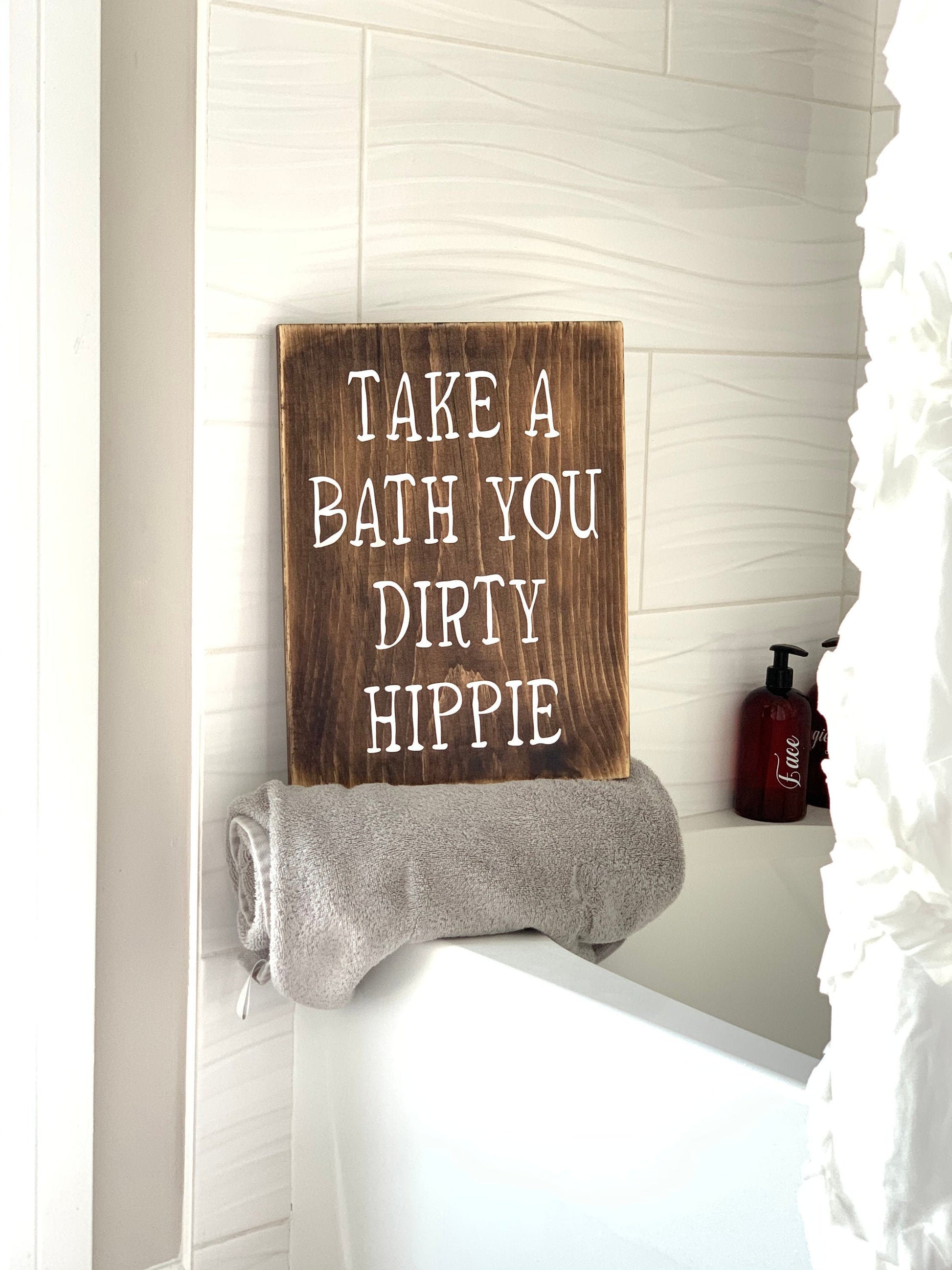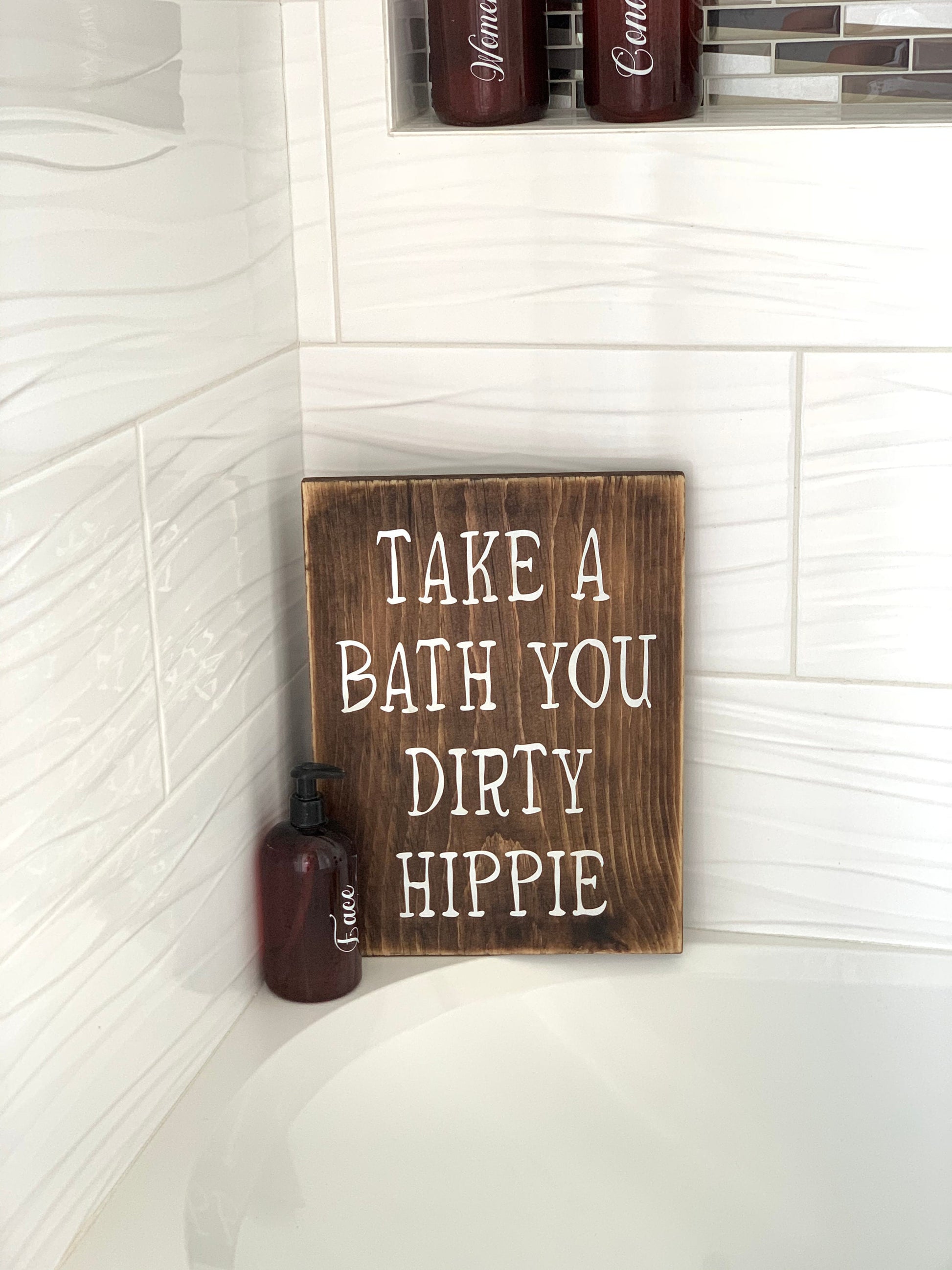 This farmhouse bathroom sign is handmade of wood. It makes a great conversational piece, and goes well with any decor.