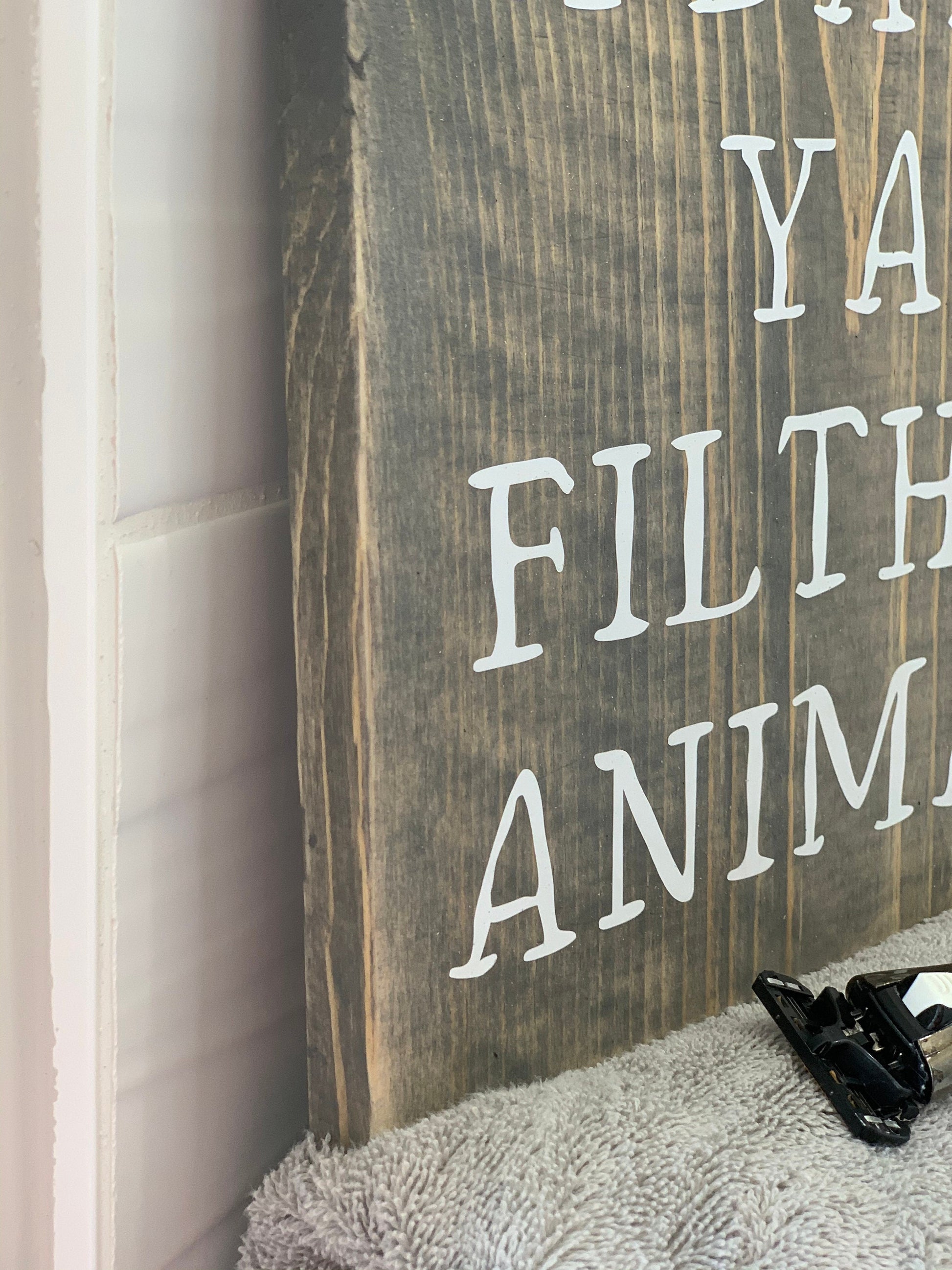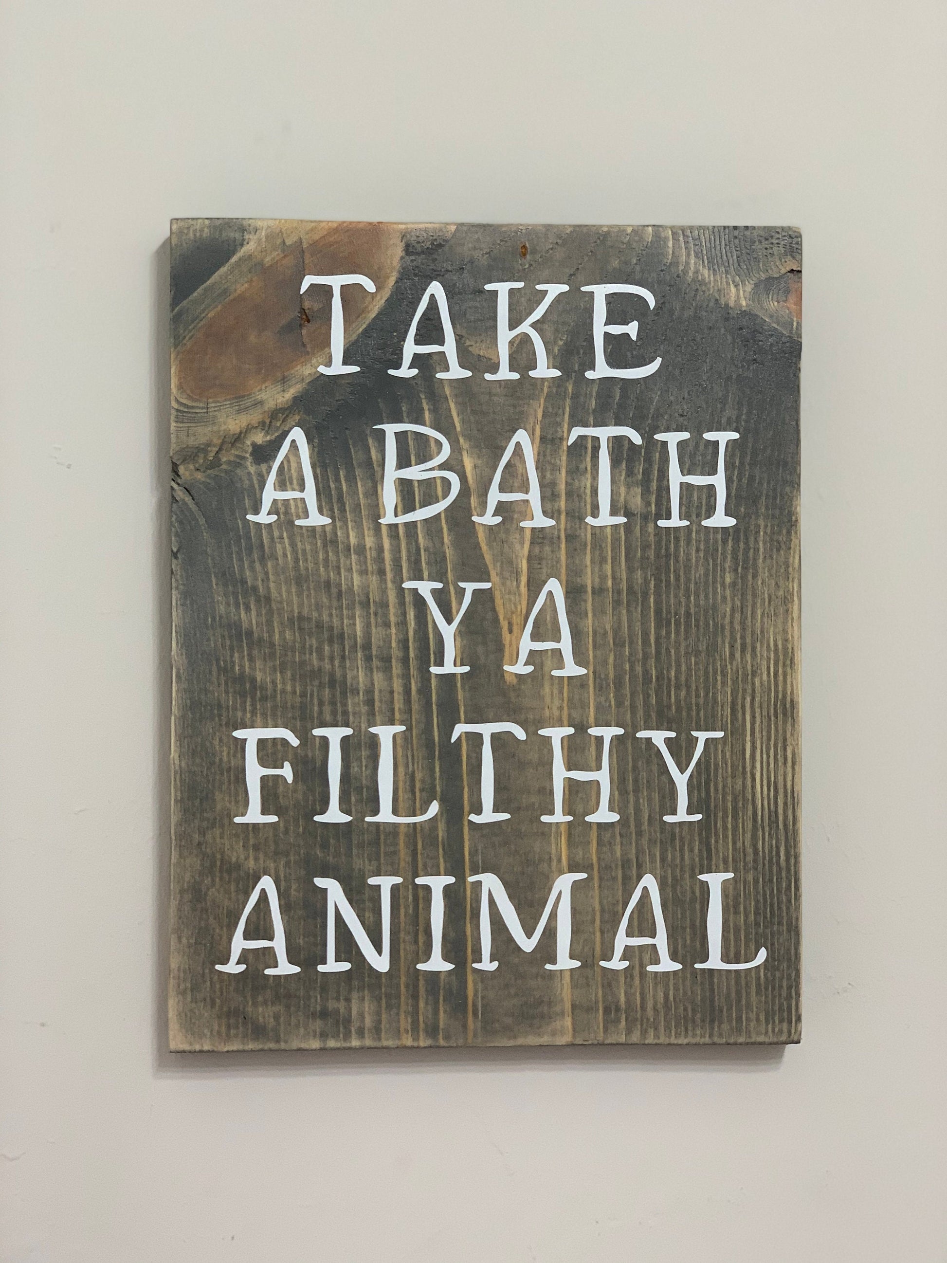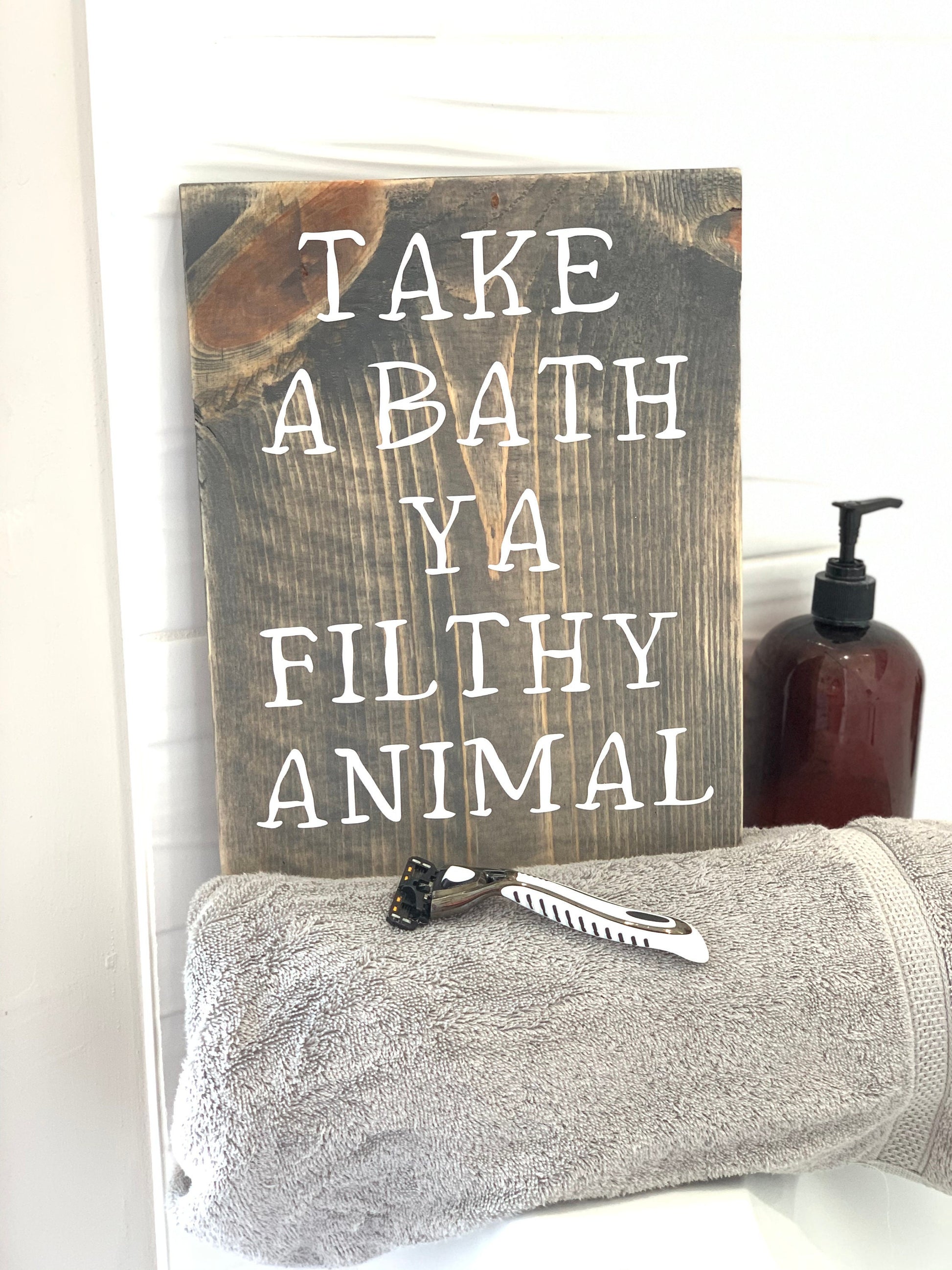 This farmhouse bathroom sign is handmade of wood. It makes a great conversational piece, and goes well with any decor.