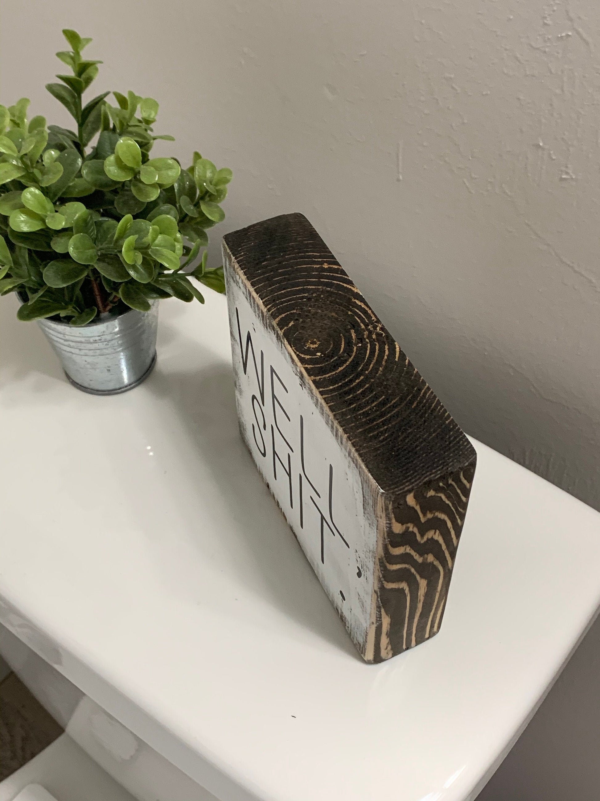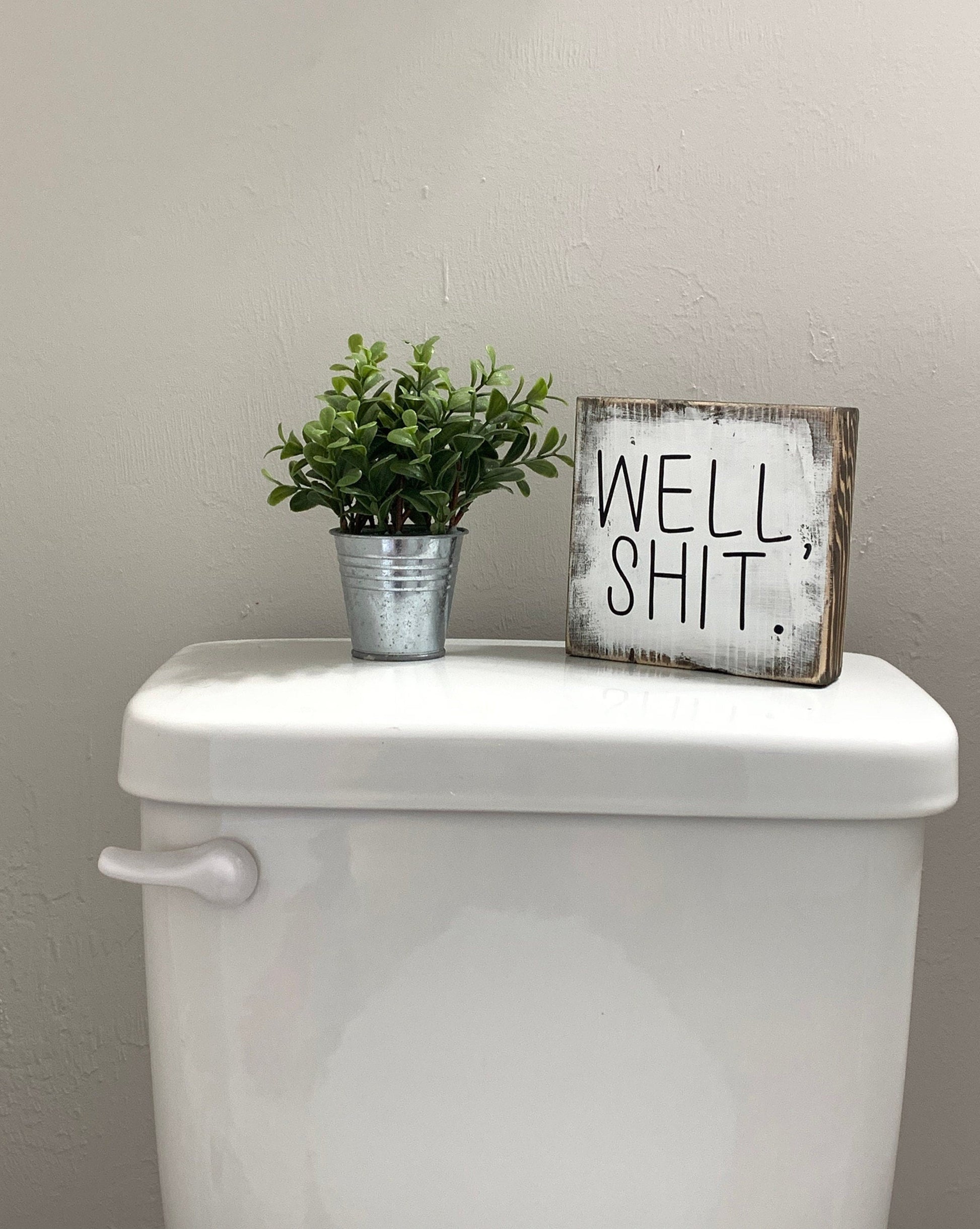 Well shit funny bathroom sign. This sign does NOT come with hanging hardware. It is meant to stand on its own. It makes a great conversation piece. It is made of wood, stained then white paint over the stain and distressed. After that, vinyl letters are applied then all is sealed.