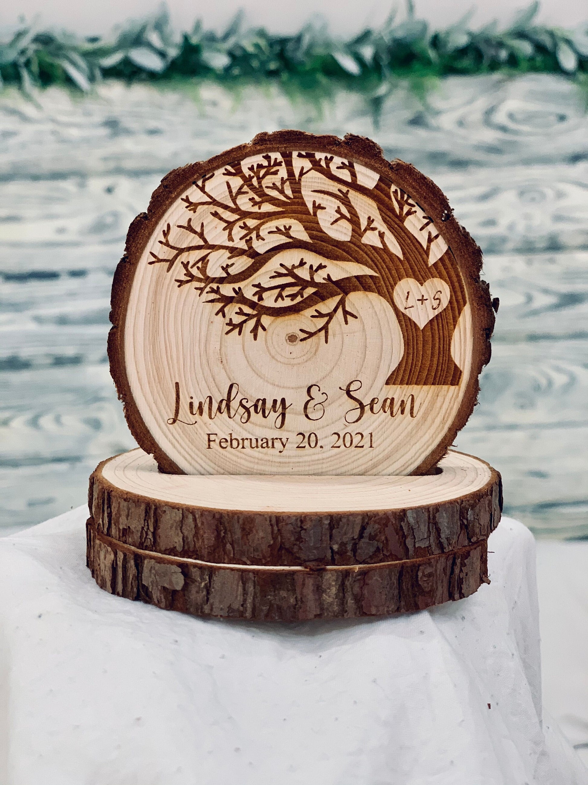 -Place the piece (with the design on it), into the cut out on the top wood slice. Then place both of those pieces on top of the 3rd and final slice. You may glue them together if you would like to, but you don't have to. It is meant to stand without glue.