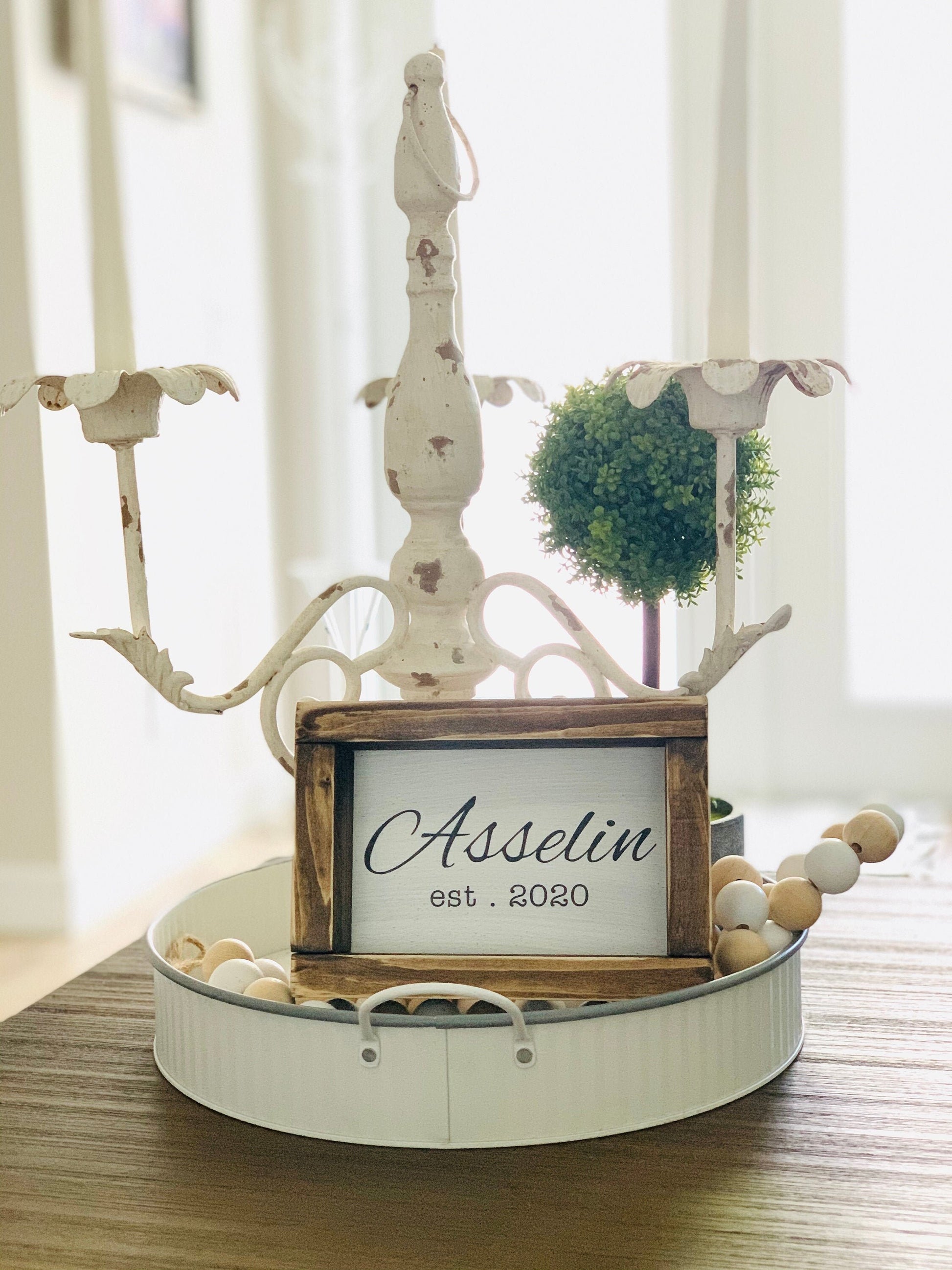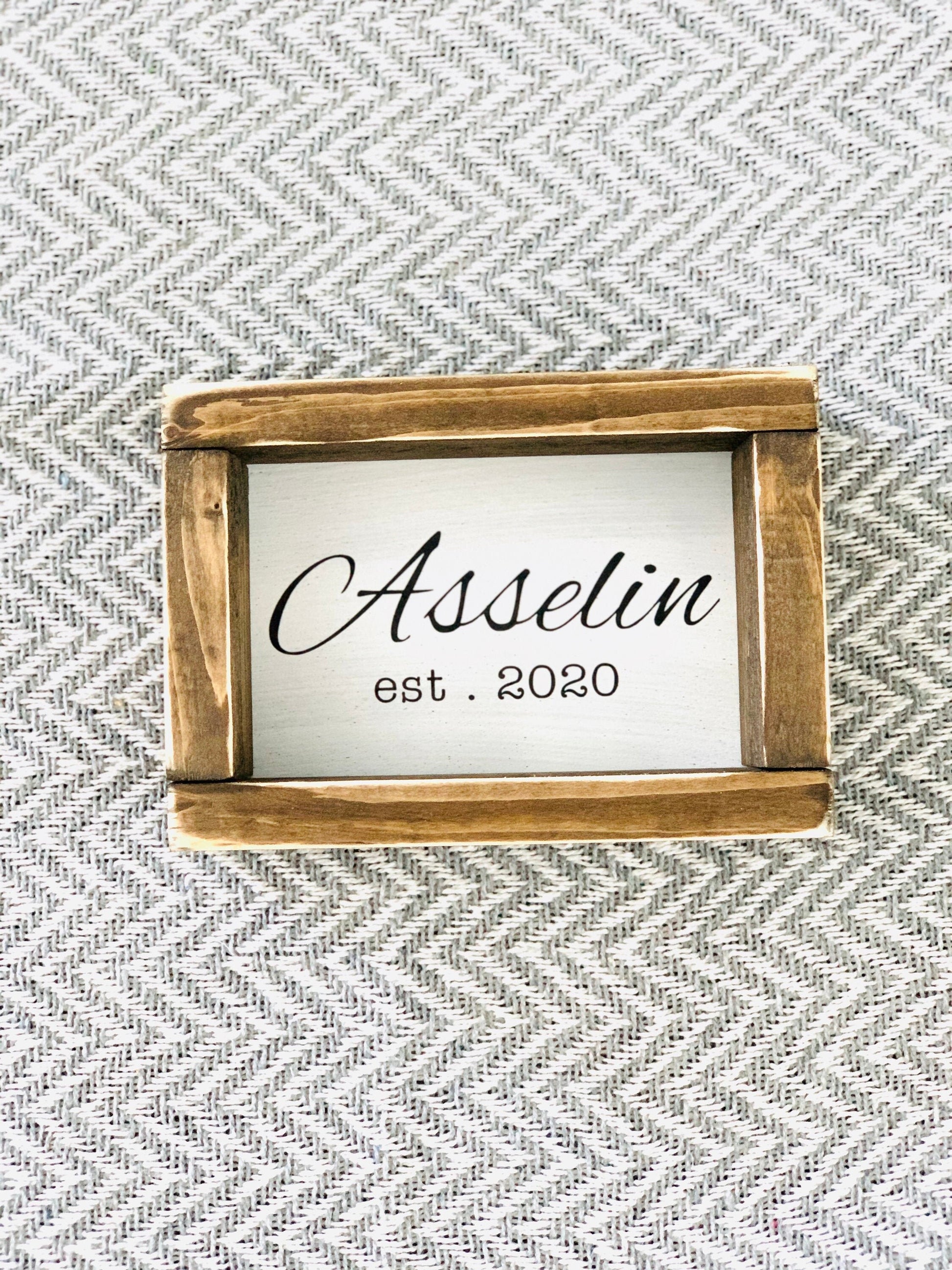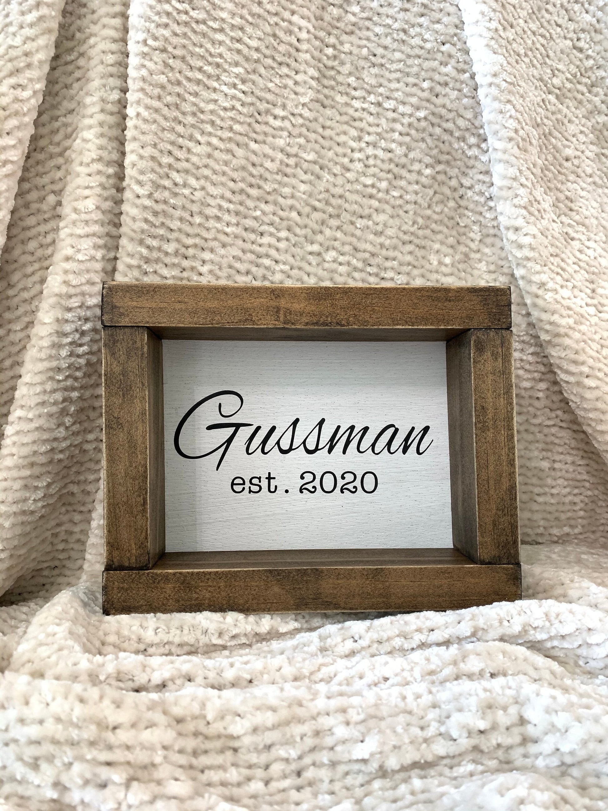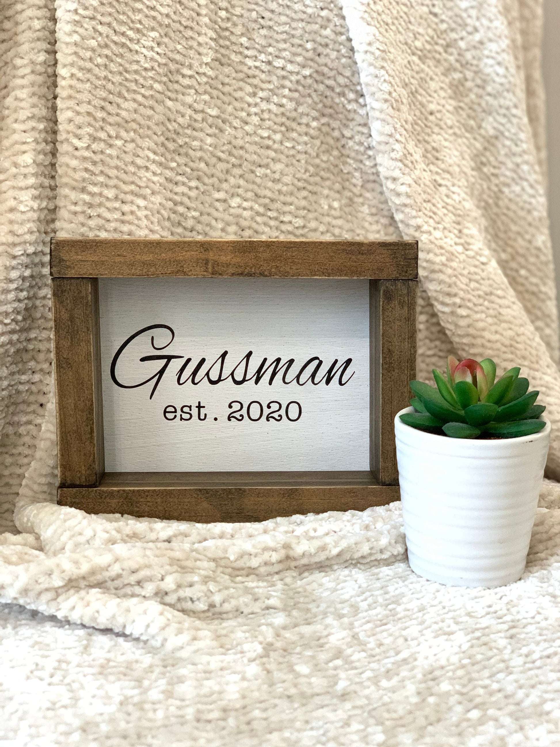 7"x 5" Wood framed last name sign. This sign does not come with hanging hardware. It is meant to stand on its own. You may add your own. Frame is wood, stained and distressed. The backing is also wood, painted and vinyl letters applied. Then all is sealed.